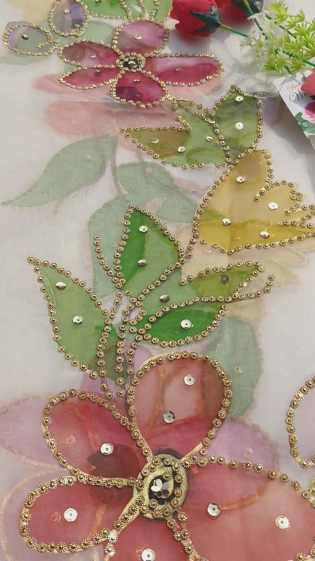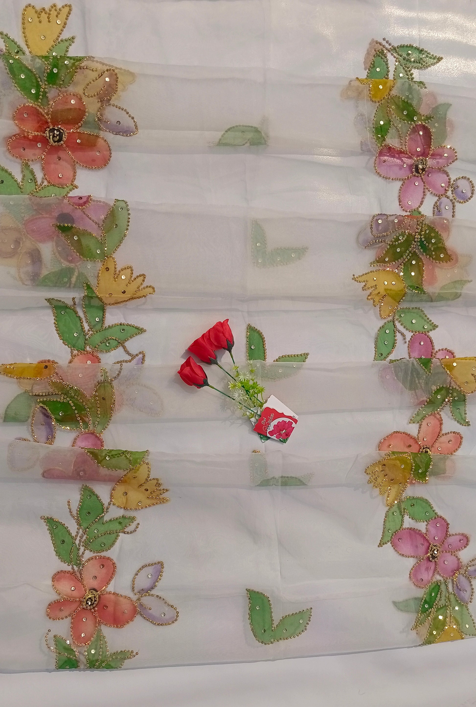 Elevate your style with this exquisite hand-painted organza dupatta, designed to bring timeless elegance to your wardrobe. Crafted on premium quality organza, this dupatta features vibrant floral motifs delicately painted by hand, highlighted with golden sequin embellishments for a subtle sparkle.