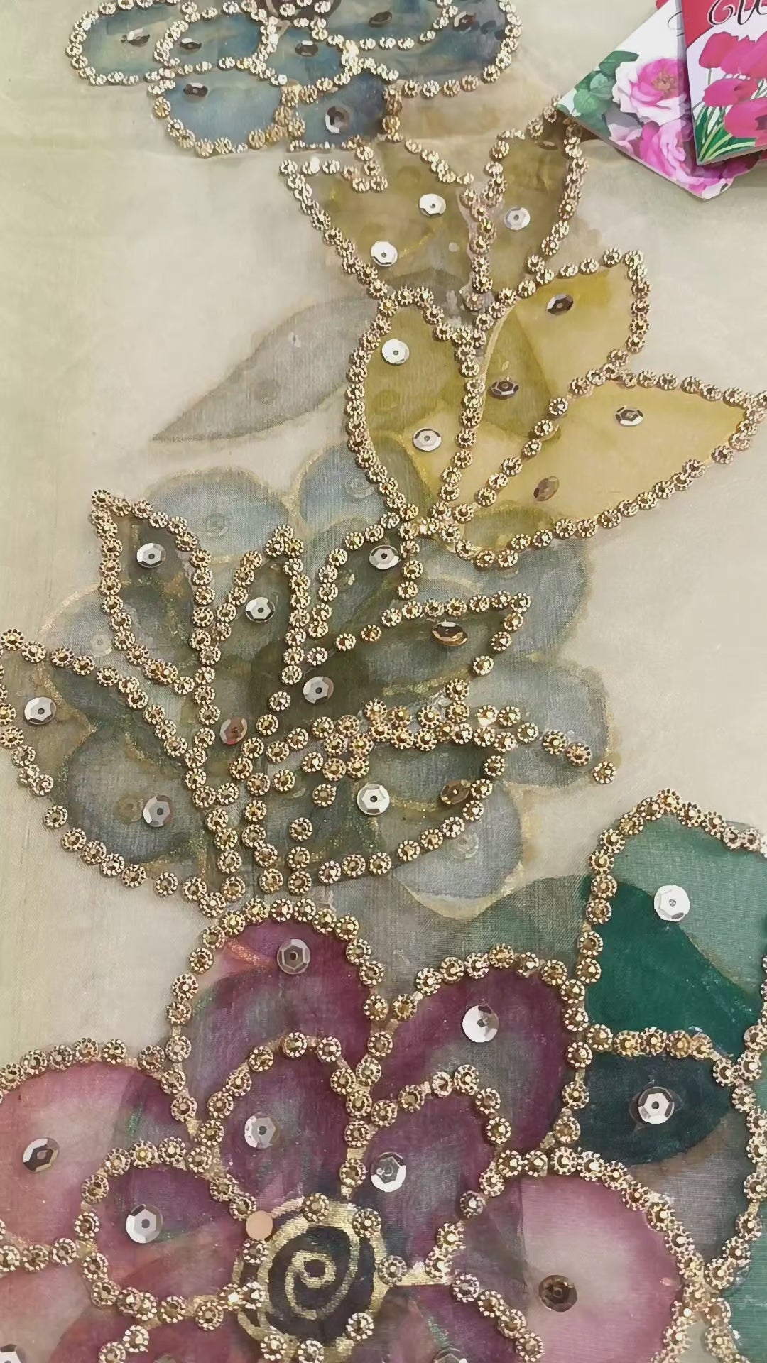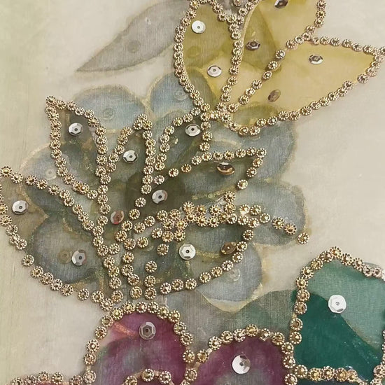 Light pista Hand-Painted Organza Dupatta with Multicolor Floral & Golden Sequin Work | Maan’s Art Fabric