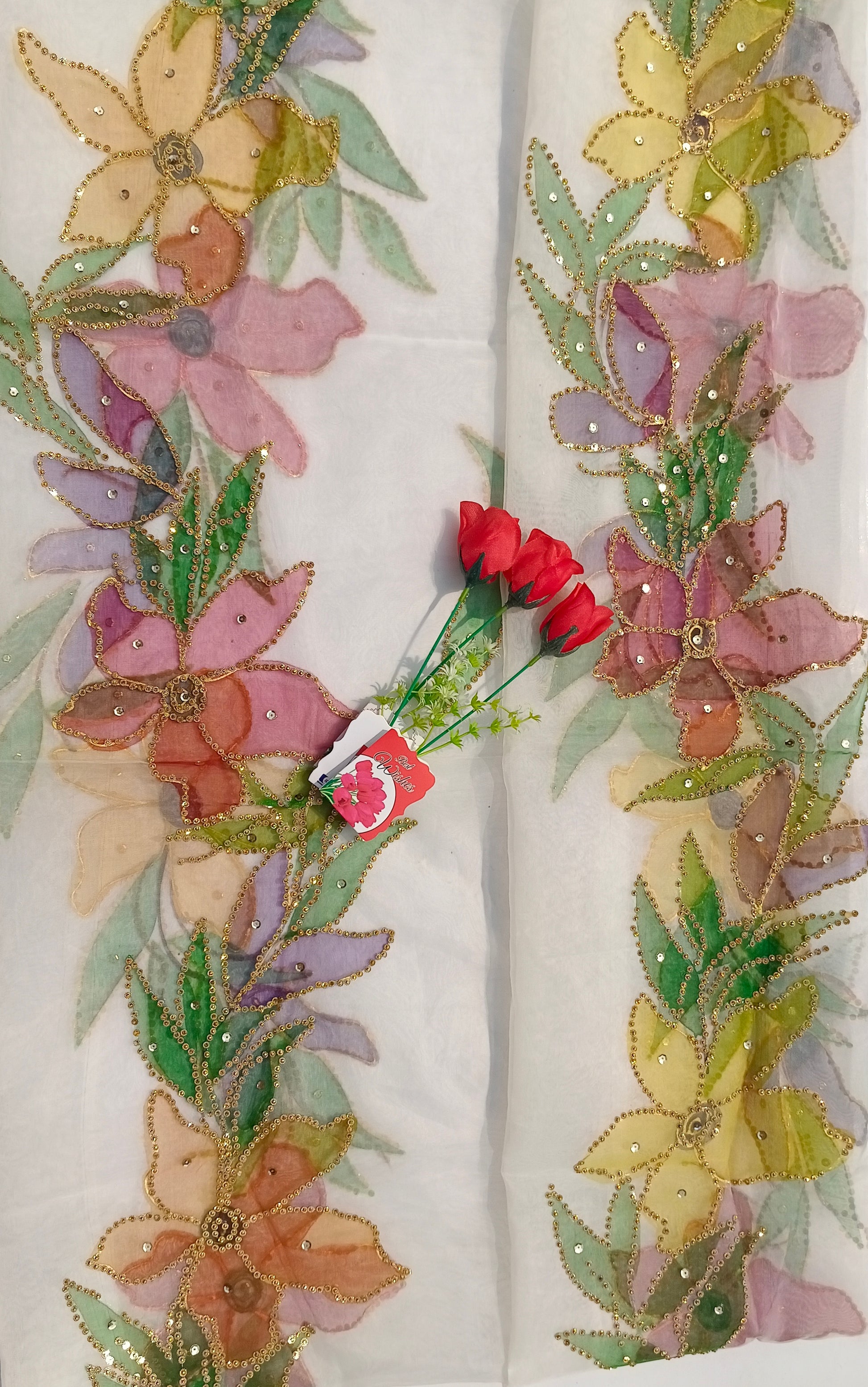 Pure White Hand-Painted Organza Dupatta with Golden Sequin Embellishments | Maan’s Art Fabric