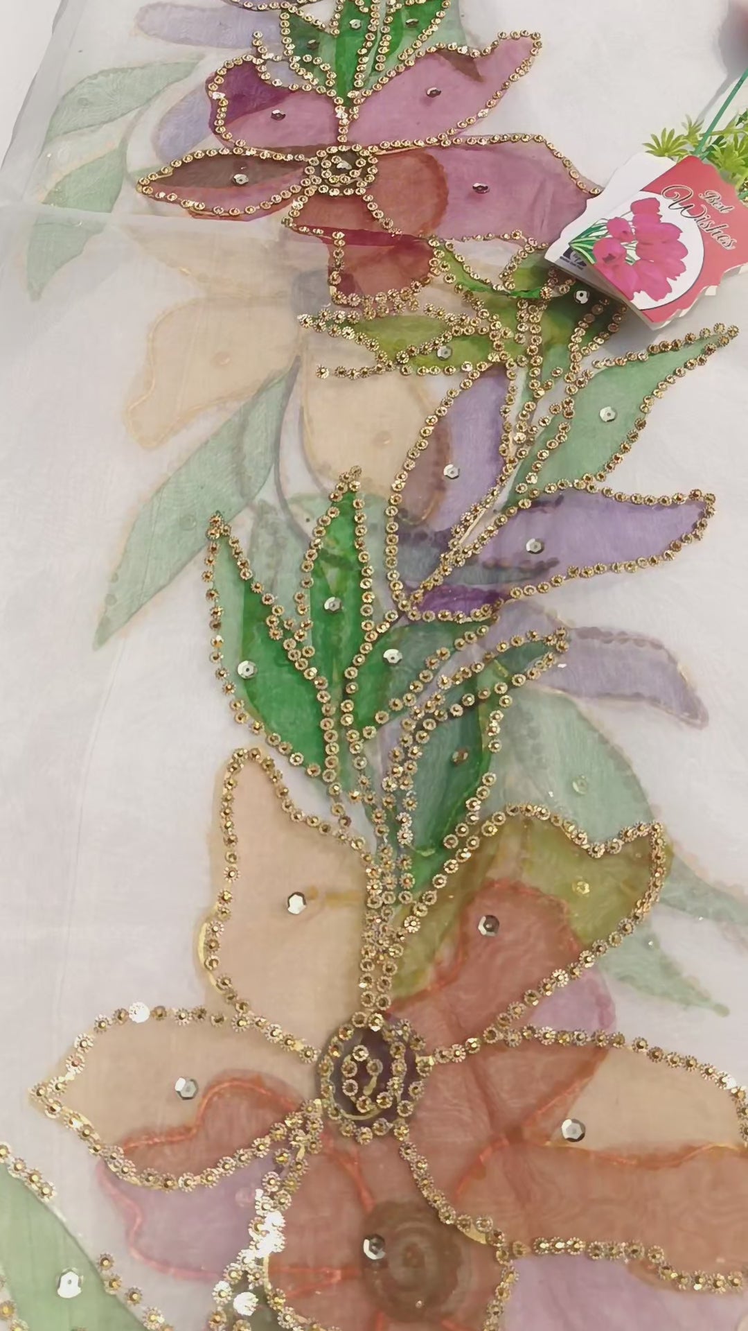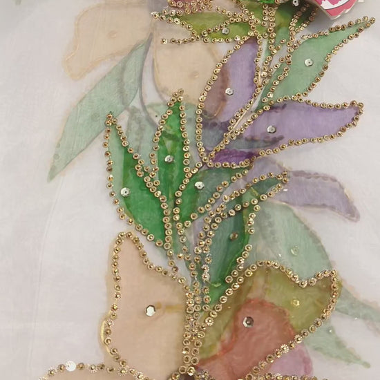 Elevate your wardrobe with this pure white organza dupatta, beautifully hand-painted with delicate floral motifs and enhanced with golden sequin embellishments for a luxurious sparkle. The sheer, lightweight fabric drapes gracefully, making it the perfect accessory for both traditional and contemporary outfits.