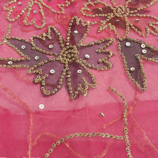 Red Hand-Painted Organza Dupatta with Golden Sequin Floral Design | Maan’s Art Fabric