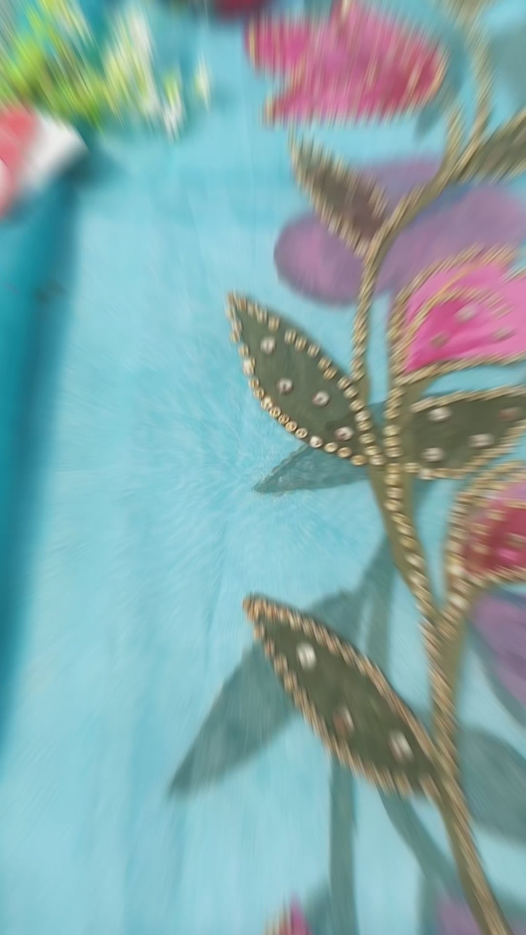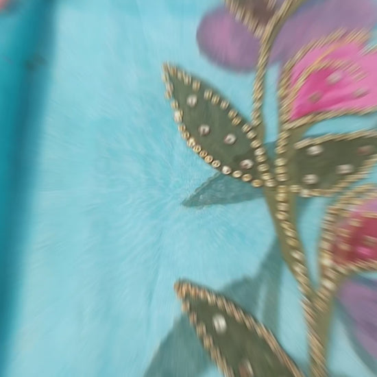Add elegance and sophistication to your style with this teal blue organza dupatta, artistically adorned with hand-painted pink floral patterns and green leafy vines. Each motif is beautifully enhanced with golden sequin detailing, adding a subtle shimmer that makes this dupatta truly eye-catching.